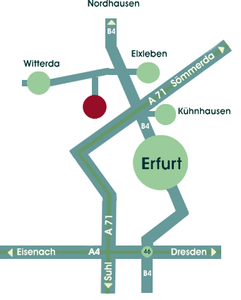 Anfahrt Wenn Sie von Westen oder Osten über die A 4 kommen, wechseln Sie an der Abfahrt 46 auf die B 4 und fahren durch Erfurt in Richtung Nordhausen. Die Bundesstraße 4 verlassen Sie nördlich von Erfurt an der Ausfahrt Elxleben und wenden sich nach links in Richtung Witterda. Sie fahren am Logistikzentrum von Finke-Möbel vorbei und sehen nach mehreren hundert Metern am linken Fahrbahnrand ein Hinweisschild mit HERMES Logo. Sie biegen hier nach links ab und folgen dieser befestigten Zufahrtsstraße zum Hermes Schießzentrum. Wir freuen uns auf Ihren Besuch. |